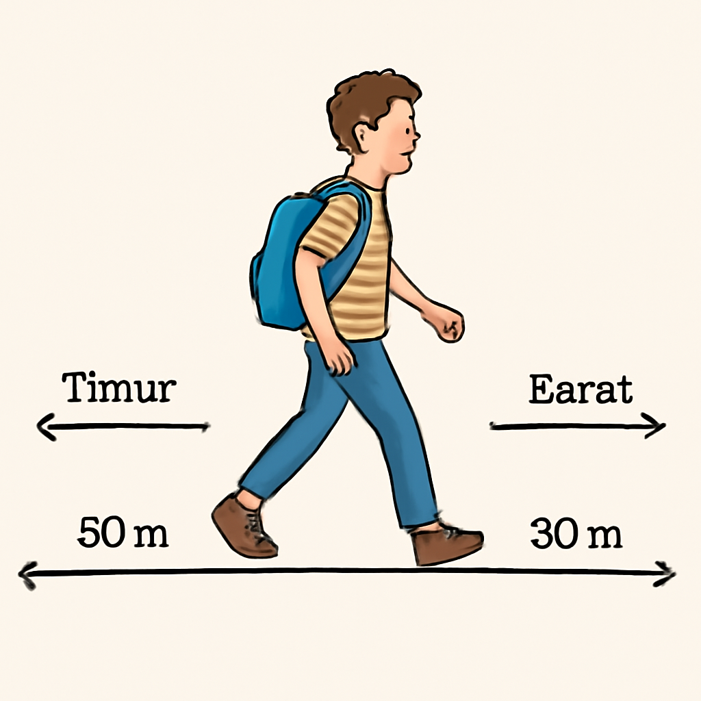 3. Seorang siswa berjalan dari titik A ke timur 80 m lalu berbalik ke barat 30 m hingga berhenti di titik B. Besar perpindahan dari A ke B dan jarak tempuh siswa berturut-turut adalah …