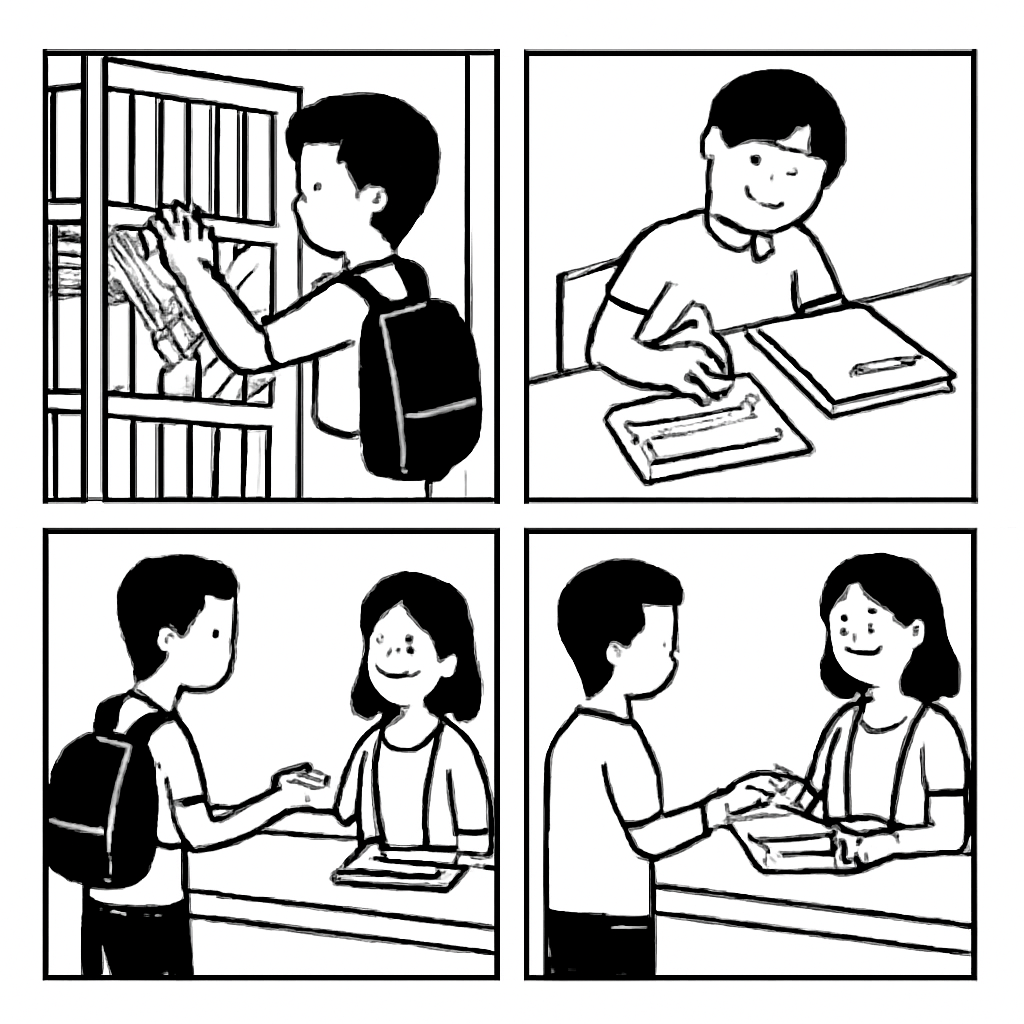 4. Bacalah teks berikut! Di perpustakaan sekolah, terdapat poster berjudul “Cara Meminjam Buku”. Isi poster itu: (1) Pilih buku di rak sesuai kelas. (2) Catat judul dan nomor panggil pada kartu peminjaman. (3) Serahkan kartu kepada petugas. (4) Kembalikan buku paling lambat tujuh hari. Ilustrasi yang PALING sesuai untuk poster tersebut adalah ....
